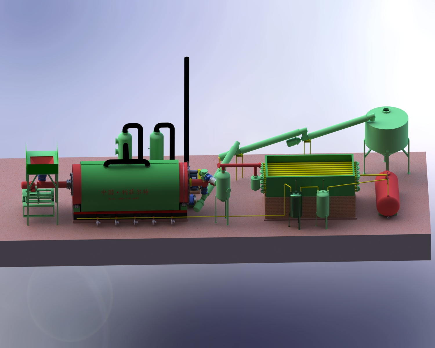 廢輪胎煉油設(shè)備是通過高溫裂解加熱分解成油氣,不可冷凝氣體和生物炭的流程,之后油氣再通過冷卻系統(tǒng)冷卻成液化油,不可冷凝的可燃性氣體可以直接回收利用于反應(yīng)釜的加熱,多余氣體也可以用于加熱其他系統(tǒng),例如過濾,燃燒器等。