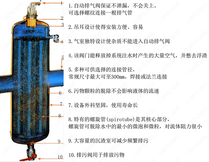 水汽分離器(脫氣除污器)。脫氣除污器連續(xù)不斷工作,發(fā)揮雙重功效的脫氣、除污,通過這個裝置可以起到凈化水系統(tǒng)中的氣泡和雜質(zhì)的功能。由于這個整合的舉動,所有的氣泡和較微小的雜質(zhì)將會被永久的脫除,保持系統(tǒng)不受氣泡和雜質(zhì)的困擾。汽水分離器它與傳統(tǒng)的過濾器和除污器的工作方式不同,維護很少。這個裝置能否在供熱系統(tǒng)里發(fā)揮它的作用取決于不同的方面。脫水除污器必須安裝在主線上,而且較好為系統(tǒng)溫度較高點。對于供熱系統(tǒng),較佳位置是供熱機組的出口。對于制冷系統(tǒng),溫度較高點在制冷機組的回水管上。